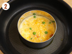 2: | フライパンにオリーブ油を入れて火にかけ、型を置き、[1]を優しく流し込み、スクランブルエッグを作るように中をかき混ぜる。 ※ここで型の内側にうっすら油を塗ると生地がくっつきにくくなります。 |