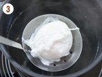 2: | 小鍋にお湯を沸かし、沸騰したらお酢大さじ1(分量外)を入れて火を止め、割った卵を1つずつ優しく流し込む。 | |