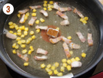 2: | 小鍋にベーコンを入れて中火にかけ、炒め、コーンも加えてベーコンの油で軽く炒めていく。 | |