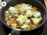 3: | 全体に火が通ったら、水とコンソメキューブを加えてひと煮立ちさせる。 | |
