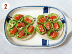 2: | イングリッシュマフィンの上にケチャップを塗り、ピーマン、ミニトマトをのせる。 | |