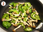 3: | フライパンに油を入れて加熱し、しめじ、ピーマンの順に炒める。 | |