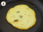 4: | フライパンを中火にかけて温まったら油を入れ、一度濡れ布巾の上に置き温度を下げた後、[3]の生地を4等分にして流し入れ両面焼く。 | |