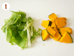 1: | かぼちゃは1㎝の厚さに、水菜は4~5㎝の長さに切る。 | |
