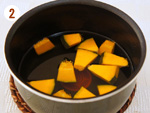 2: | 小鍋にだし汁とかぼちゃを入れて中火でかぼちゃが柔らかくなるまで煮る。 | |