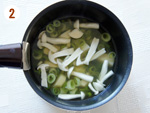 1: | 里芋は皮をむいて一口大に切る。長ねぎは小口切りにし、しめじは石づきをとって手でほぐす。[1] | |