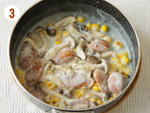 2: | 鍋にオリーブ油を入れて火にかけ、[1]とコーンを加えて炒める。 | |