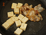 2: | フライパンに豚ばら肉を入れて火にかけ、油が出てきたら豆腐も入れて焼き、火が通ったら一度取り出す。 | |
