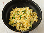 3: | ②のフライパンにごま油を入れて火にかけ、①のごはんを入れて炒める。 | |