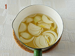 1: | 玉ねぎは5㎜幅にスライスし、だし汁とともに鍋に入れて火にかける。 | |
