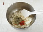 1: | 梅干しは果肉をを包丁でたたいてじゃこ、白いりごま、ごはんを合わせる。 | |