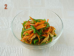 2: | フライパンにオリーブ油をひき、中火で①を炒め、にんじんがしんなりしたらオイスターソースを加えて全体に絡める。 | |