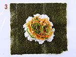 3: | 台の上にラップを広げ焼き海苔をのせ中心にごはんの半量、②をのせる。 | |