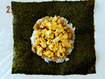2: | 台の上にラップを広げ焼き海苔をのせ中心に(A)をあわせて枝豆ごはんの半量、そぼろ、スクランブルエッグの順にのせる。 | |
