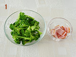1: | ブロッコリーは小房に分けて硬めに塩ゆでをした後、ひと口大に切る。ベーコンは1.5㎝幅に切る。 | |