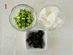 1: | 大根は皮をむいて5㎜幅のいちょう切りにする。大根葉は洗って2cmの長さに切る。 | |