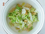 2: | 油揚げ、白菜、生姜、水の順に鍋に入れて蓋をし、中火で3~4分蒸し煮にする。 | |