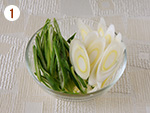 1: | ねぎは斜め薄切りにし、卵はボウルに溶きほぐしておく。豆腐は1.5㎝角に切る。 | |