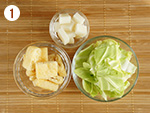 1: | キャベツはひと口大のざく切りにし、油揚げは2㎝角に切る。切り餅は1.5㎝角に切る。 | |