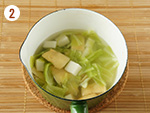 2: | 鍋にだし汁と①を入れて中火にかけ、切り餅が柔らかくなるまで3~5分ほど煮る。 | |