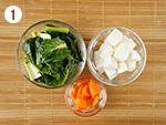 1: | はんぺんは1.5㎝角に切り、小松菜は長さ4~5㎝に切り、にんじんは薄いいちょう切りにする。 | |