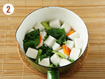 2: | 鍋にだし汁とにんじんを入れ中火にかけ、にんじんに火が通ったらはんぺんと小松菜を加えて1~2分加熱する。 | |
