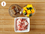 1: | 豚肉は幅1.5㎝に切って酒を振りかけておき、かぼちゃとこんにゃくは2㎝角に切る。 | |