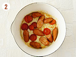 2: | 鍋にサラダ油を入れ中火にかけ、ソーセージとミニトマトを炒める。 | |