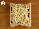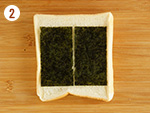 2: | 食パンに味海苔を並べて乗せ、①をまんべんなく広げチーズを乗せる。 | |