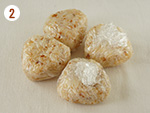 2: | ①を4つに分けて好きな形のおむすびにする。 (ラップを使うと手が汚れにくく、衛生的です。) |