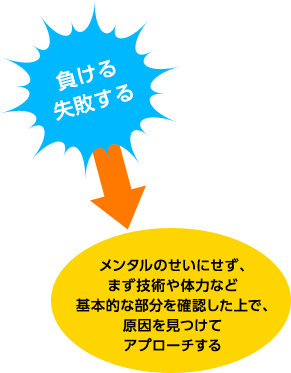 最近スポーツ心理学、特にメンタルトレーニングが認知されてきて、負けるとすぐ「メンタルが弱いせいだ」と言われます。確かにメンタルもあるでしょうが、私自身テニスのコーチをやっていた経験から言わせていただくと、負ける原因は、実は大体が技術や体力の問題で、メンタル以外のものだったりします。なのにメンタルだと決めつけてアプローチしても、結局は深みにハマっていきます。急がば回れで、もう1度体力や技術を見直した上で、やっぱりメンタルにも問題があった、と結論付けないといけません。