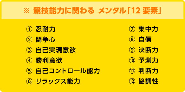 一概に「メンタル」と言っても 種類があって、九州大学徳永幹雄名誉教授らが作成したDIPCA(心理的競技能力検査)によれば、12の要素に分けられます。(※)