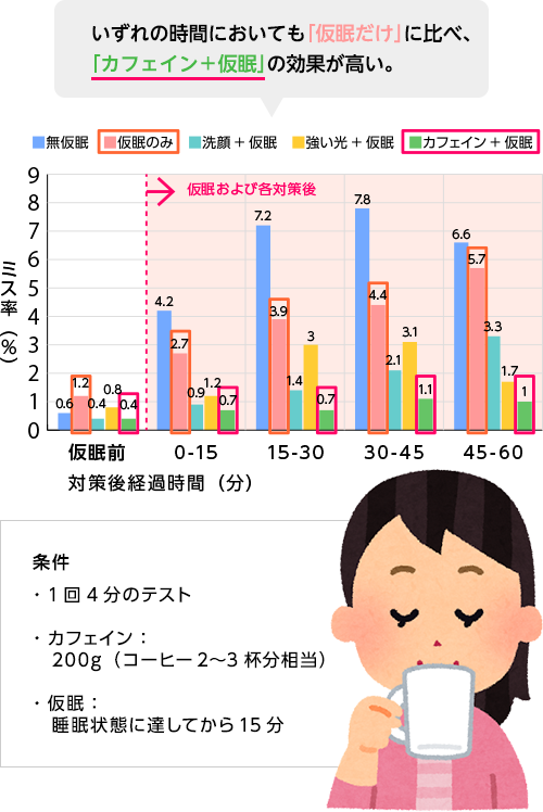 胃の中に入っている状況ではカフェインは作用しないので、カフェインが体の中に吸収され、それが効きはじめる時間をちょうど昼寝から目覚めたい時間に合わせるのがポイントです。 - 編集部: