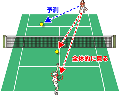 以前「集中力」について研究するため、テニス選手のレシーバー側にアイカメラを使って調査したところ、予測の下手な選手は、ボールを見ていればコースが分かると思うのか、ボールをずっと目で追って見ていることがわかりました。ところが予測が上手な選手達は、ボールも時々見ますが、相手選手の目を見たり、ラケットの入り方を見たりと、全体を見ながらその動きに予測を立てて判断していました。すなわち「的は中間にある」ということなんです。