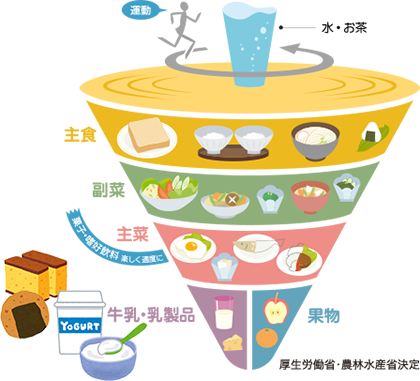 私も絶対そう思います! だから食事バランスガイドのコマの「ひも」の部分はしこう品やしこう飲料のように、ちゃんと“ゆとり”の部分が入っているんです。「ひも」は、コマ(食事)を回すための補助に使われます。楽しみとかゆとりなどは、食事の面でも大事です。