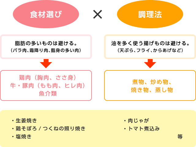 “主菜”の材料になるものの、消化に時間がかかる脂肪が多いものもあり、また揚げものは脂質が多く胃もたれの原因にもなるので要注意!!