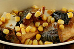 缶汁をそっと流し入れ、ふんわりとラップをしたら電子レンジ600wで1分半加熱し、コーンを全体にちらす。