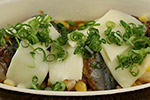 さばの身は骨にそって縦(たて)半分に割り、厚あげは食べやすい大きさに切り、耐熱(たいねつ)容器に並べる。