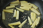 フライパンにオリーブ油を入れ中火にかけ、じゃがいもをいためる。