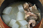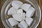 大根は皮をむいてひと口大に切り、下ゆで用の水と生米とともに耐熱容器に入れふんわりとラップをして電子レンジ600wで8分加熱する。