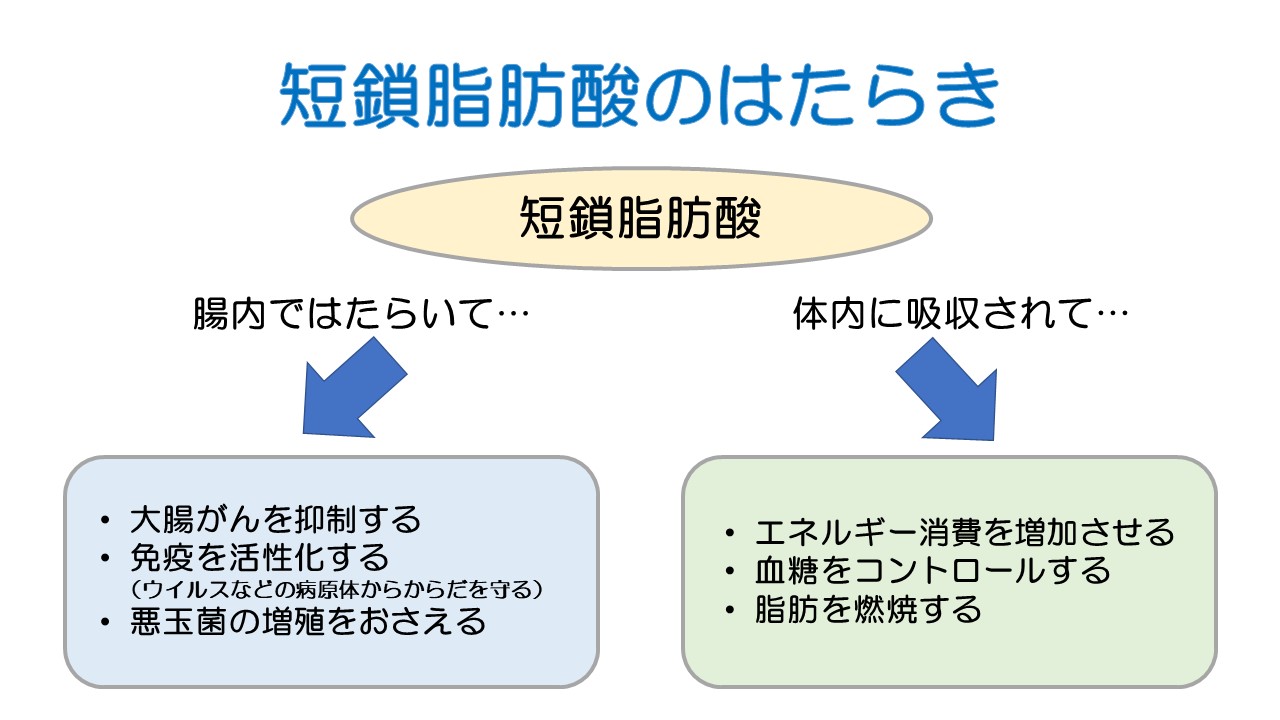 善玉菌といわれる菌は、短鎖脂肪酸という酸を出します。その酸が健康に役立つのです。例えば、体内に吸収された短鎖脂肪酸は、エネルギー消費の増加や血糖のコントロール、脂肪燃焼など、生活習慣病予防に有益に働きます。また、短鎖脂肪酸は大腸内でもはたらき、大腸がんをおさえたり、免疫を活性化させたりしてくれます。