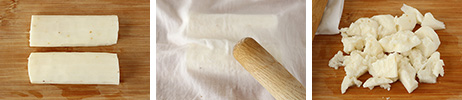 長いもは皮をむき(むかなくてもOK)、縦半分に切ってまな板の上に置き、濡らした清潔な布巾等をかぶせて麺棒で軽く叩く。