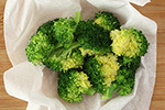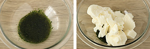 ブロッコリーは塩ゆでをしたのちさらに小さく切った後、さらしやキッチンぺーパー等で優しく水気をとる。