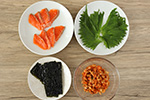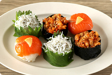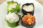 大葉を巻いた酢飯にはしらすを、韓国のりを巻いた酢飯にはキムチ納豆をのせる。