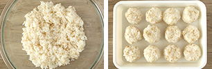 お米が炊けたら熱いうちに寿司桶やボウルに移し、すし酢と柑橘果汁を合わせたものを3回に分けて加えその都度しゃもじで切るように混ぜる。粗熱が取れたら12等分にして丸める。