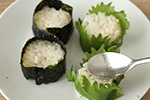 12個のうち、4つには大葉を、4つには韓国のりを巻く。小さいスプーンを水で濡らして上部を軽く抑えながら巻くと形をきれいに保つことができます。