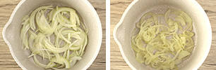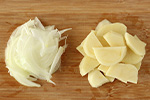 玉ねぎは薄くスライス、じゃがいもは5㎜幅の半月切りにする。(水にはさらさない)