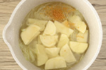 じゃがいもと水、顆粒コンソメを加えて蓋をし、弱めの中火でじゃがいもが柔らかくなるまで6~7分加熱する。