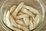 ごぼうは皮をこそげ落としてひと口大の乱切りにし、水に5分ほどさらす。