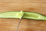 きゅうりは縦半分に切りスプーンの柄を使って種を掻き出すようにして除き、5㎜幅の斜め切りにする。